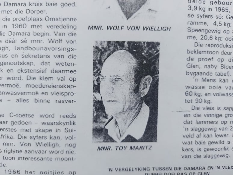 (Reference: Interview with Daantjie van Vuuren; ‘The origin of the Damara Sheep’, Damara Skaap Nieuws, vol 2, 1990; ‘Who were the artists?’ I&J Rudner, Archaeological Notes from South West Africa; Damara sheep, Wikipedia)