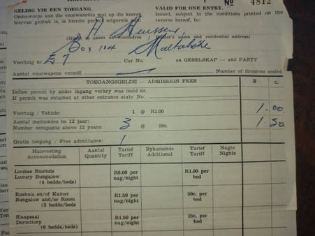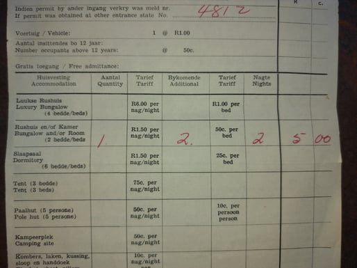 I had a closer look at the yellowed paper and indeed it was so. A two-night stay with two additional people (at 50c extra per person) cost R5, whereas a luxury bungalow sleeping four would set you back R5 a night and a campsite 50c per person.