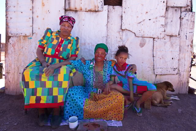 On my journeys I have been dazzled by the vivid colours of the Herero women’s regal long dresses. I have appreciated the bright colours of the Owambo traditional dress and those of the shebeens that colour the roadside of the North in all the shades on the artist’s palette. On my most recent trip I joined up with friend-photographer Lambert Heil and wordsmith Ron Swilling and ventured to the opposite end of the country, to the South, to explore the colourful world of the Nama. The cheerful colours of their houses and their rainbow-coloured laslappie trousers, dresses and hats brightened up the dusty streets of Mariental, Gibeon, Maltahöhe and the surrounding settlements.