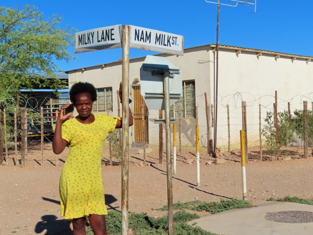 There were more striking people and items to catch our attention on that sunny afternoon: the first was Regina Kosmas’s sunflower-yellow dress as she stood at the Milky Lane road-sign and Justine Willemse’s ‘basterkappie’ that was bleached into pure cotton cleanliness by decades of use in the bright Namibian sunshine. She told us that her ouma used to wear it on the farm when she was tending sheep. ‘Now everyone wants it,” she said. “But I’m not giving it away, I’m going to keep it in the family.”