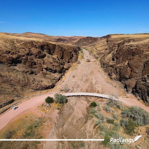 More than sixty years later, like most travellers heading to the Sossusvlei surrounds from Swakopmund or Walvis Bay, I enjoyed travelling this way, crossing over the small single-lane bridge that now spans the Kuiseb riverbed. Although not as daunting, the route is still adventurous and exciting, even more so after the rains when the Kuiseb runs to the sea and the landscape is cloaked in green. The Kuiseb and Gaub passes traverse striking canyon scenery, and the road takes you past the Tropic of Capricorn and the frontier stop of Solitaire as it ushers you into a spectacular landscape with majestic mountains and burnished dunes.