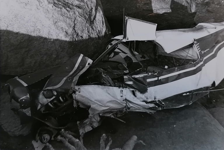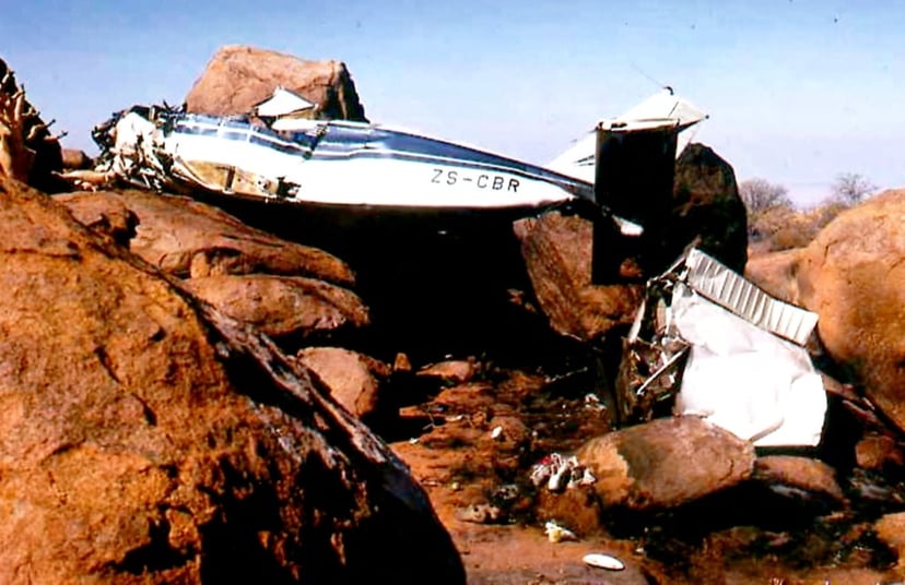 The group arrived at the base of the mountain on Friday 11 June and started climbing early the next morning in a very strong east wind. As they ascended, they heard the sound of the Piper with Jan and Tim on board on their way to the airstrip. The sound of the engine suddenly ceased and in the distance they saw a cloud of dust or smoke rise up into the sky. Shocked, they hurried up the mountain, giving way to a leopard they encountered along the path. When they reached the airstrip there was no sign of the plane. Searching the area, they came across the wrecked aircraft wedged between the rocks, two hundred metres away.