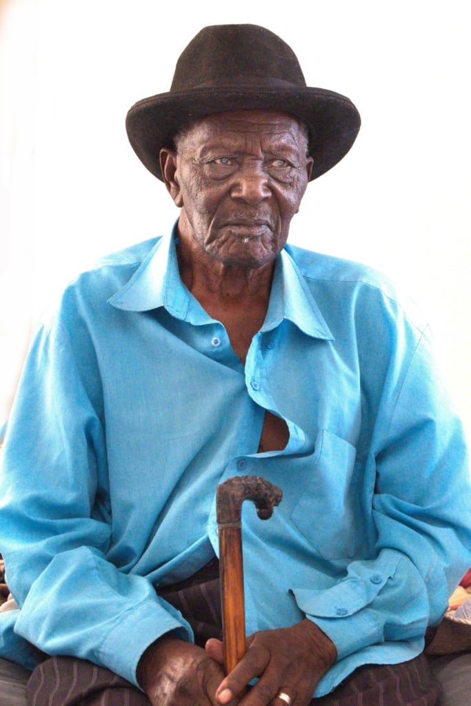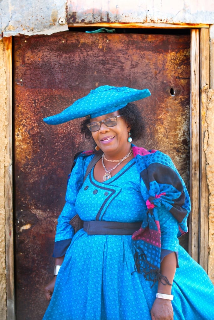 Early in the morning, in the Okeruru village in Aminuis, we came across Philadelphia (Kumbee) Tjikuzu resplendent in her turquoise blue traditional Herero dress. ‘Ek gaan dorp toe’ (I’m going to town), she told us. Before she went on her way she happily posed for a few photographs with her neighbour, Alexander (Jozikee) Kahuva.