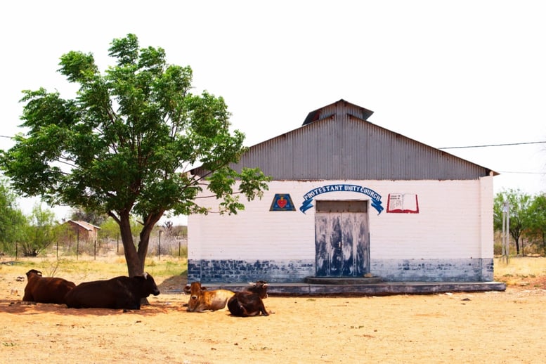 As the temperature soared, the cattle outside the Protestant Unity Church had the right idea and lay in the shade of a tree. The women’s striking Herero dresses continued to rule the day, adding a bright and regal beauty. Milka Kahiiko looked like an African queen as she waited outside a small shop that was emblazoned with advertisements for MTC. The colour of her dress perfectly matched the MTC shade of blue.