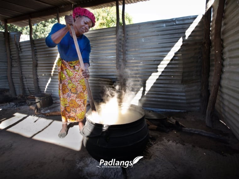 After enjoying a meal of porridge, fish and relish, generously offered to us and prepared by the school secretary, we continued on our journey to visit the Sikwekwe Living Culture Traditional Village. We were met by the members who welcomed us with exuberant singing, drumming and dancing. The group guided us around the traditional village, swishing their reed skirts as they danced, and demonstrated various traditions from the pounding of grain to blacksmithing.