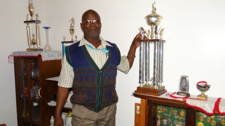 I first visited Kappies eight years ago in Oranjemund. It was easy to locate the friendly outgoing man. He invited me in and showed me his hall of fame, glittering with the many trophies he had won in his athletics career. I visited him again this year when I was in the North. When I arrived at his home in the village of Okapya2 north of Ondangwa, he was busy working in his garden looking fit and full of energy as he approaches his seventh decade. He told me that he still walks up to ten kilometres a day, visits his cattle post regularly and has never touched a drop of alcohol. “Running was for the love of running,” he told me. “Those days money wasn’t an issue.” His first sponsorship was for shoes, togbags and tracksuits. Kappies introduced me to his wife, Juliane, and we all sat talking in the garden, reminiscing about his glory days of running and his many achievements. To this day I remain a huge fan.