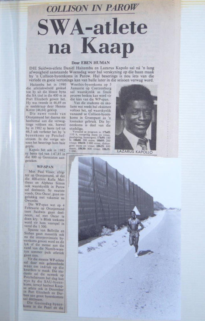 He competed for the first time on a national level when he represented his school in the ‘South West Africa Athletics Sports Union Championships’ in Windhoek in 1975, running 1500, 3000 and 5000 metre events and setting new record times in each. The turning point in his life came three years later in 1978 when he was spotted at the ‘South West Africa Athletics Championships’ in Otjiwarongo by Consolidated Diamond Mines – CDM – (now Namdeb) and asked if he was interested in a job opportunity. He was, and was soon employed in Oranjemund as a sports coordinator, a position he held for many years. This enabled him to compete in many national and international athletics events. Kappies became a record breaker in the 800-metre event when he won first place in the Diamond & Gold Division in February 1980 with a time of 1:49.47, becoming the first Namibian to run it under two minutes.