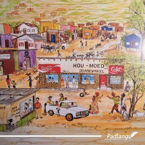 The colourful painting of Hou-Moed, painted by Carola, still graces the walls of Damara Mopane Lodge.